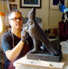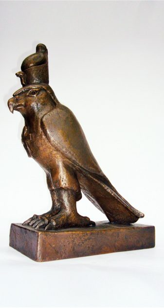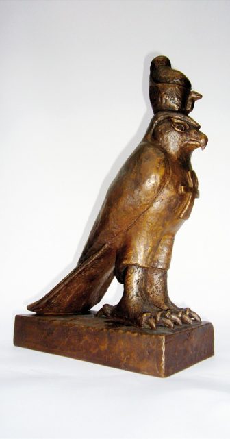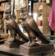 Die auf dem Bild dargestellten beiden Horuse sind im Detail unterschiedlich ausgearbeitet. Der eine Horus stellt die weibliche Variante, der andere die männliche Variante dar. Nachdem die beiden Horuse zunächst in Ton von mir fertig gestellt wurden, ließ ich die beiden Arbeiten von einer erfahrenen Handwerksfirma in dem sehr aufwändigen, aber auch überaus spannenden Wachsausschmelzverfahren zu zwei Bronzefiguren gießen.